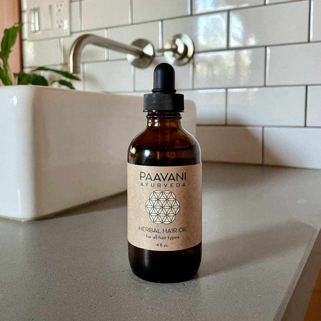 The application of herbal-infused oil to the hair & scalp is a traditional Ayurvedic practice that supports healthy, strong & lustrous locks. Balancing to all doshas (or hair types), our Hair Oil infuses India’s quintessential hair tonic, Bhringaraj, with strengthening Brahmi, antioxidant-rich Ashwagandha & cleansing Amalaki into a base of moisturizing Sesame Oil & Vitamin E-rich Sunflower Oil to replenish & revive your hair & scalp.